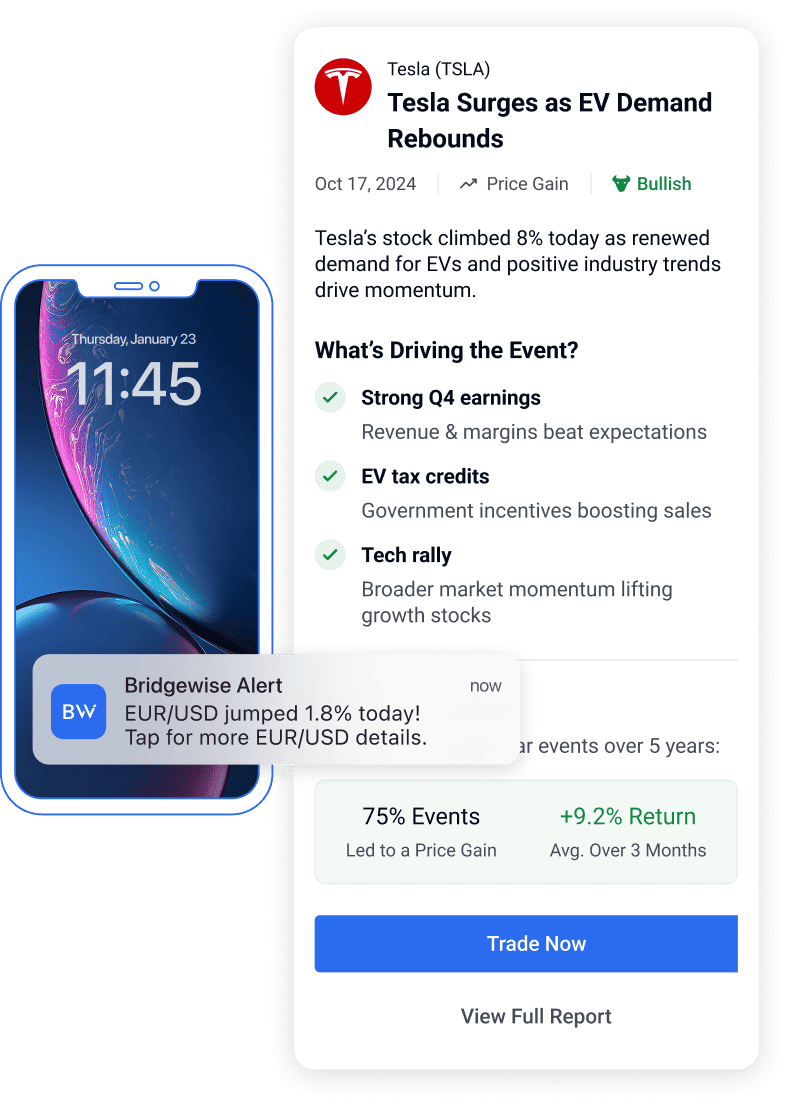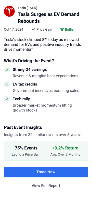 Near real-time, personalized market alerts with contextual reasoning and statistical outcome analysis