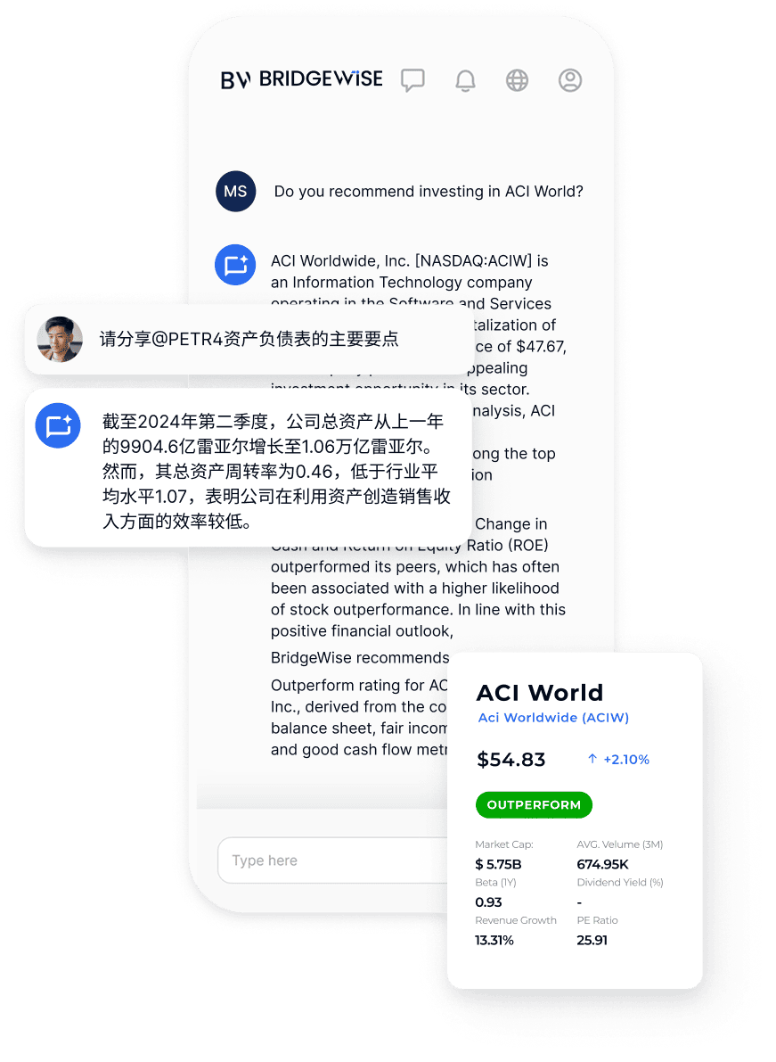 An all-in-one, compliant LLM chat that combines BridgeWise’s investment intelligence, including macro events and news report analysis, with your proprietary data to boost investor activity.