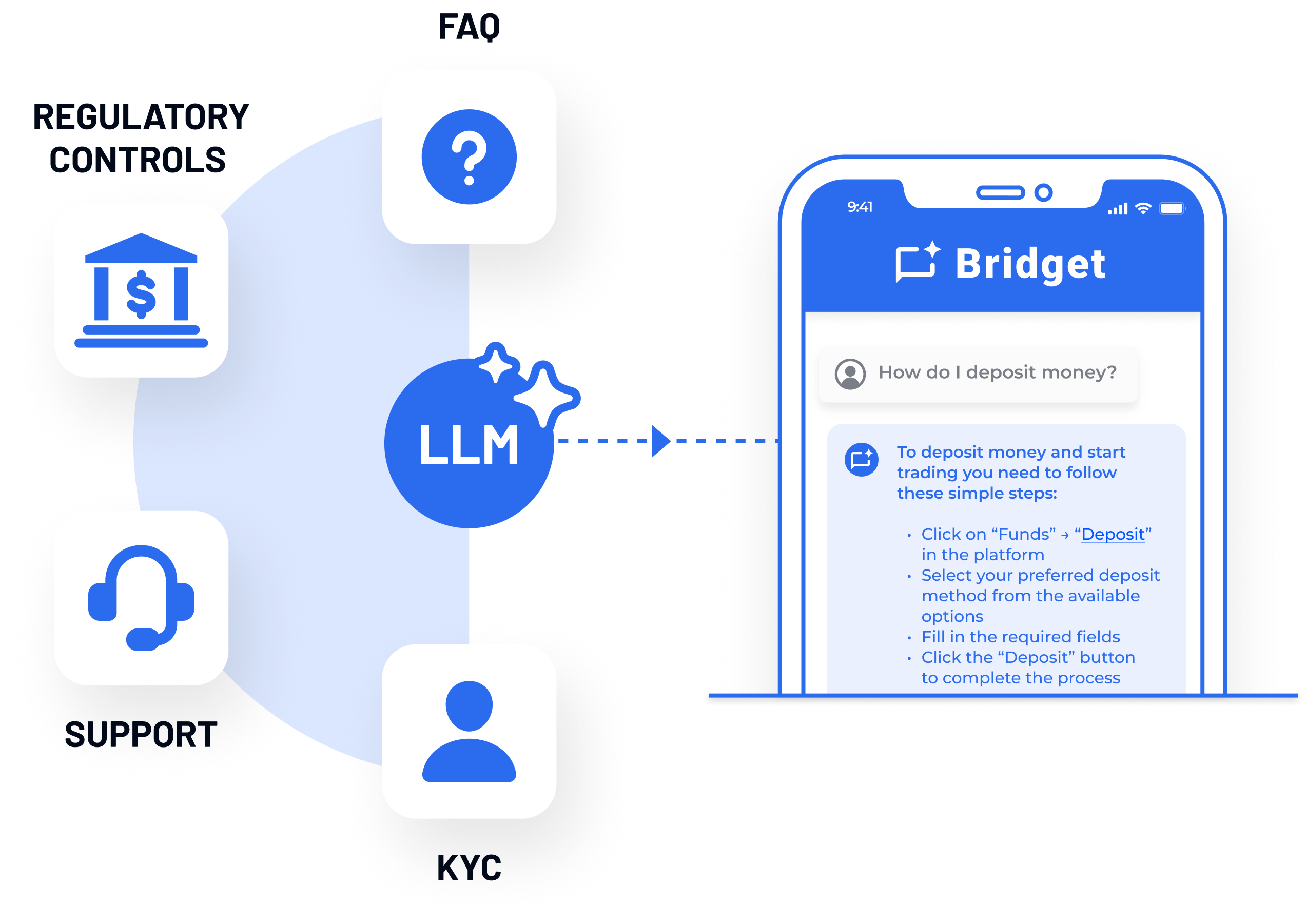 By integrating with your internal APIs, Bridget™ can access live user profiles, market data, or transactional information to provide highly relevant, personalized responses.