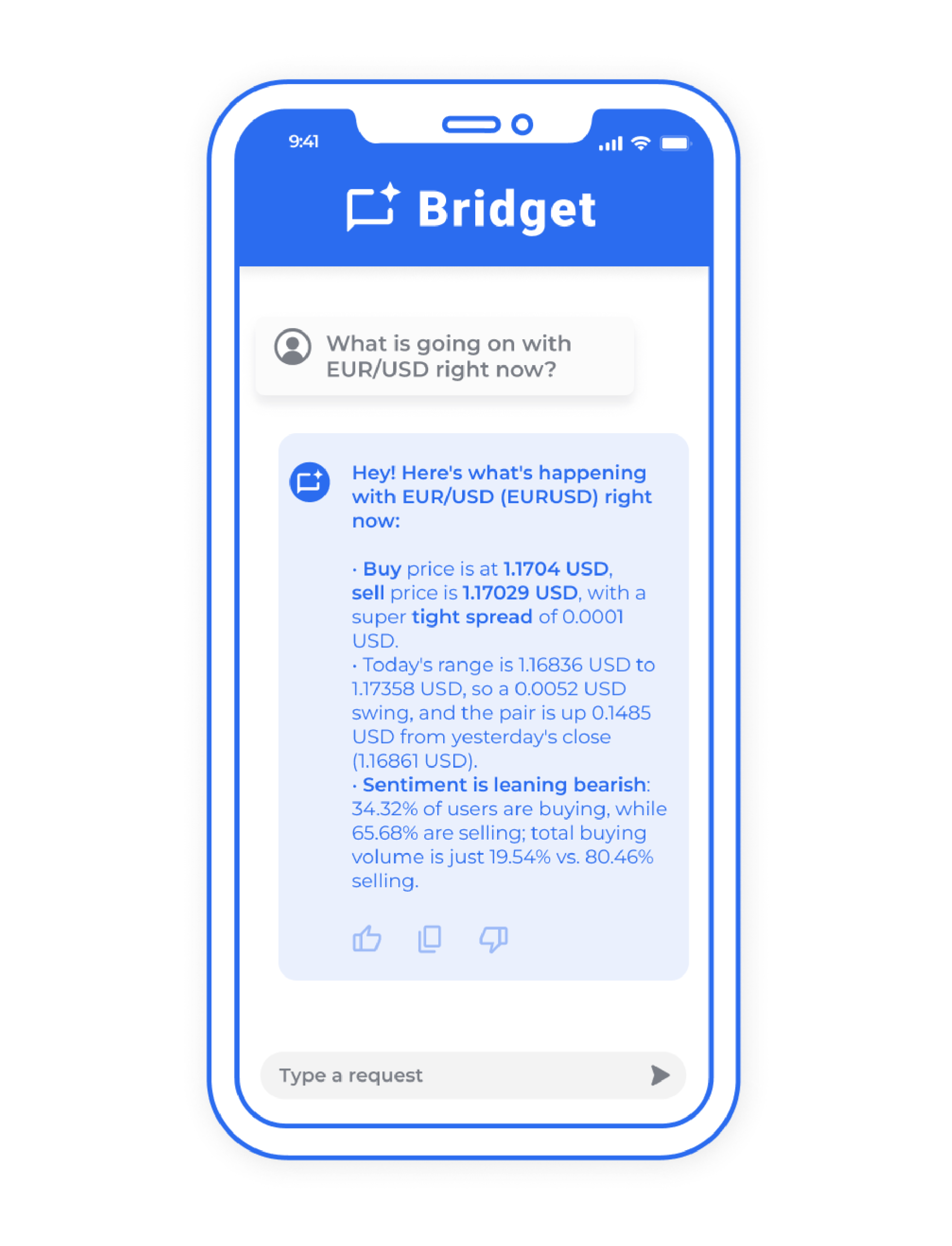 Upgrade your trader experience with compliant LLM chat that combines BridgeWise’s trading support, including macro events and news report analysis, with your proprietary data, like FAQs, chat-to-trade links, CTAs, and live feeds.